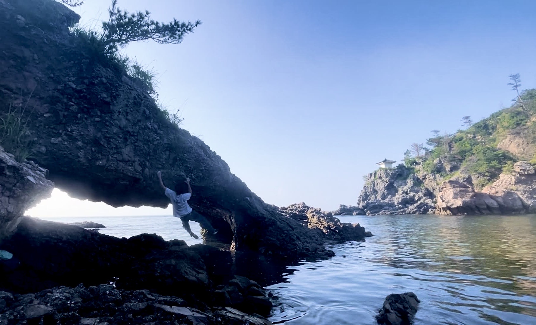 手首状の岩塔を一周するラインが良く、潮が満ちる前に登れた。